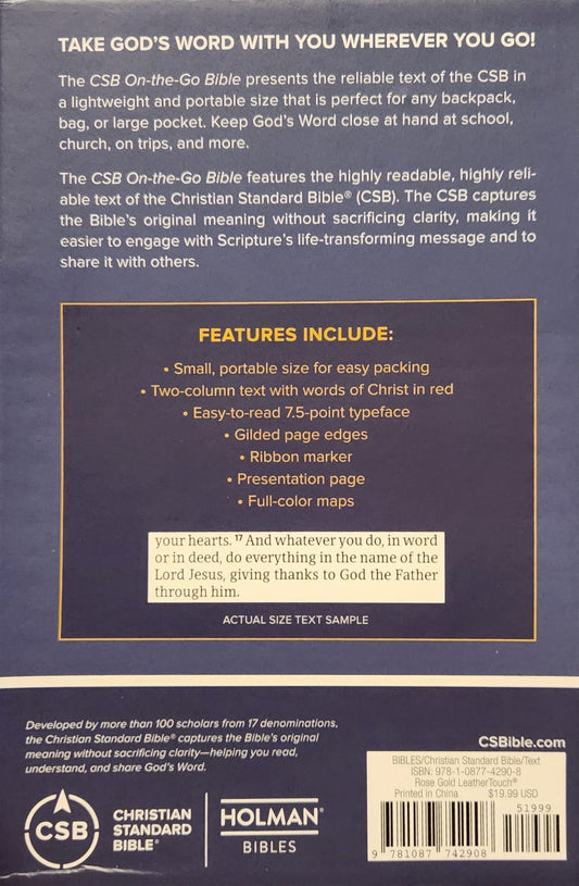 CSB On-The-Go Bible - Biblia en Ingles, Rose Gold LeatherTouch