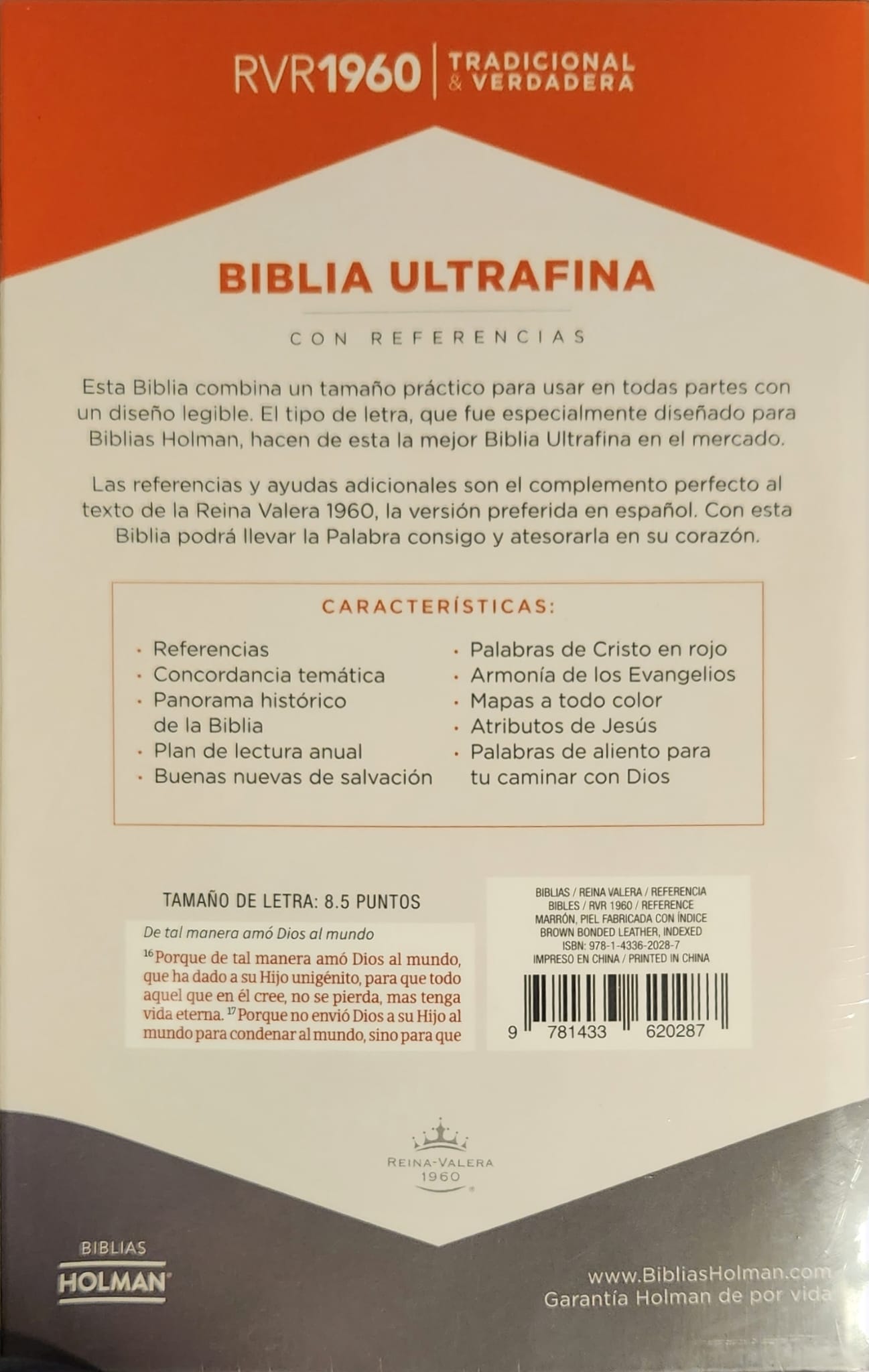 Esta Biblia combina un tamaño práctico con un diseño legible para usar en todas partes. El tipo de letra, que fue especialmente diseñado por Biblias Holman, y las características estándar adicionales, hacen de esta la mejor Biblia Ultrafina en el mercado. Con el texto de la Reina-Valera 1960, la versión preferida en español, podrá llevar la Palabra consigo y atesorarla en su corazón.