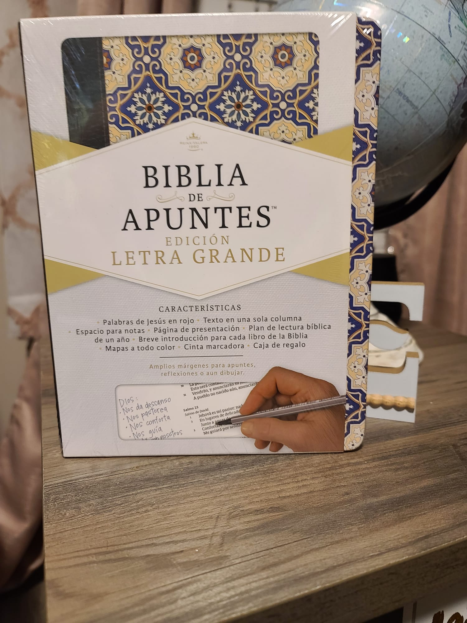 Ahora en edición letra grande, la Biblia de Apuntes Reina Valera 1960, ha sido diseñada para mejorar el estudio personal de la Biblia y la preparación de clases y predicaciones. Esta Biblia contiene la popular versión Reina-Valera 1960. Provee espacio para tomar notas en cada página, observaciones, anotar pensamientos, formular preguntas y sugerencias para exploración adicional en el texto.